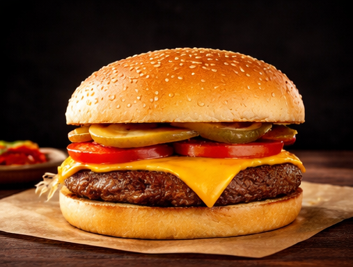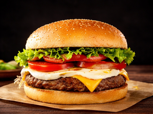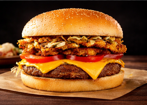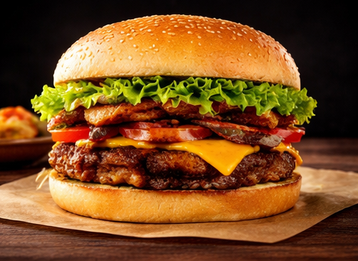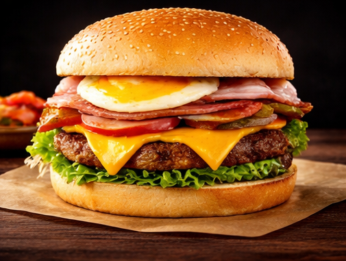 Pão, hambúrguer, coração, queijo, presunto, alface, tomate, milho, ervilha, pepino, maionese da casa, batata palha.