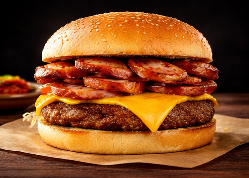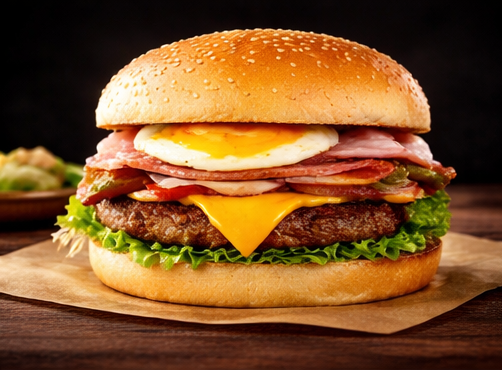 pão, hambúrguer, queijo, presunto, batata palha, maionese da casa.