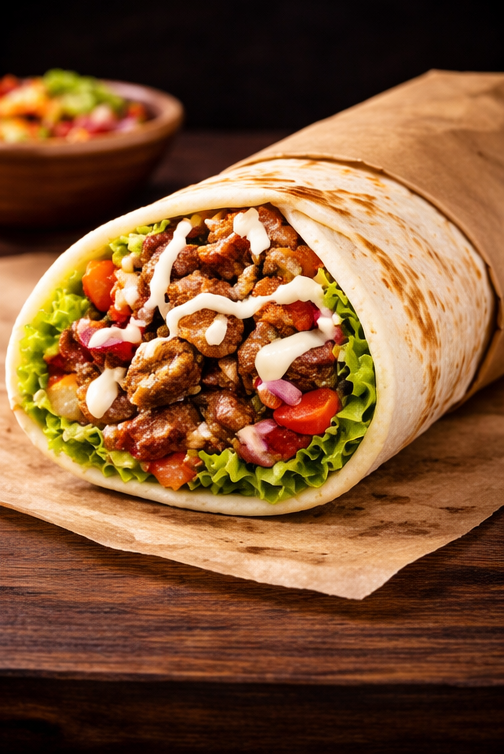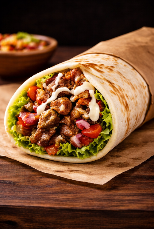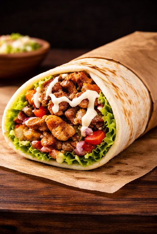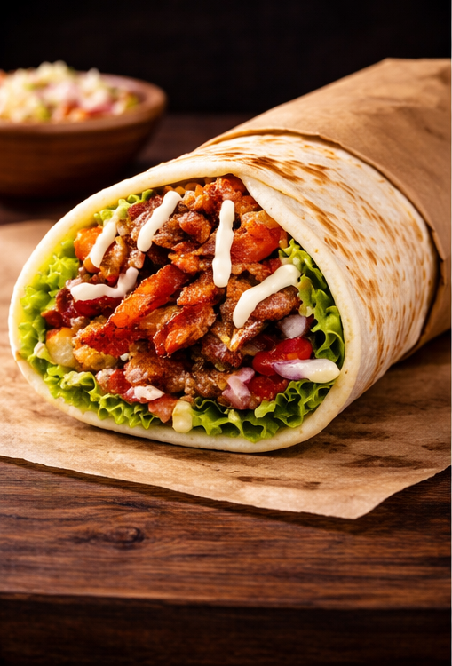 Pão árabe, frango, bacon, alcatra, repolho, alface, pepino, cebola roxa, tomate, batata frita, molho especial, creme de alho.